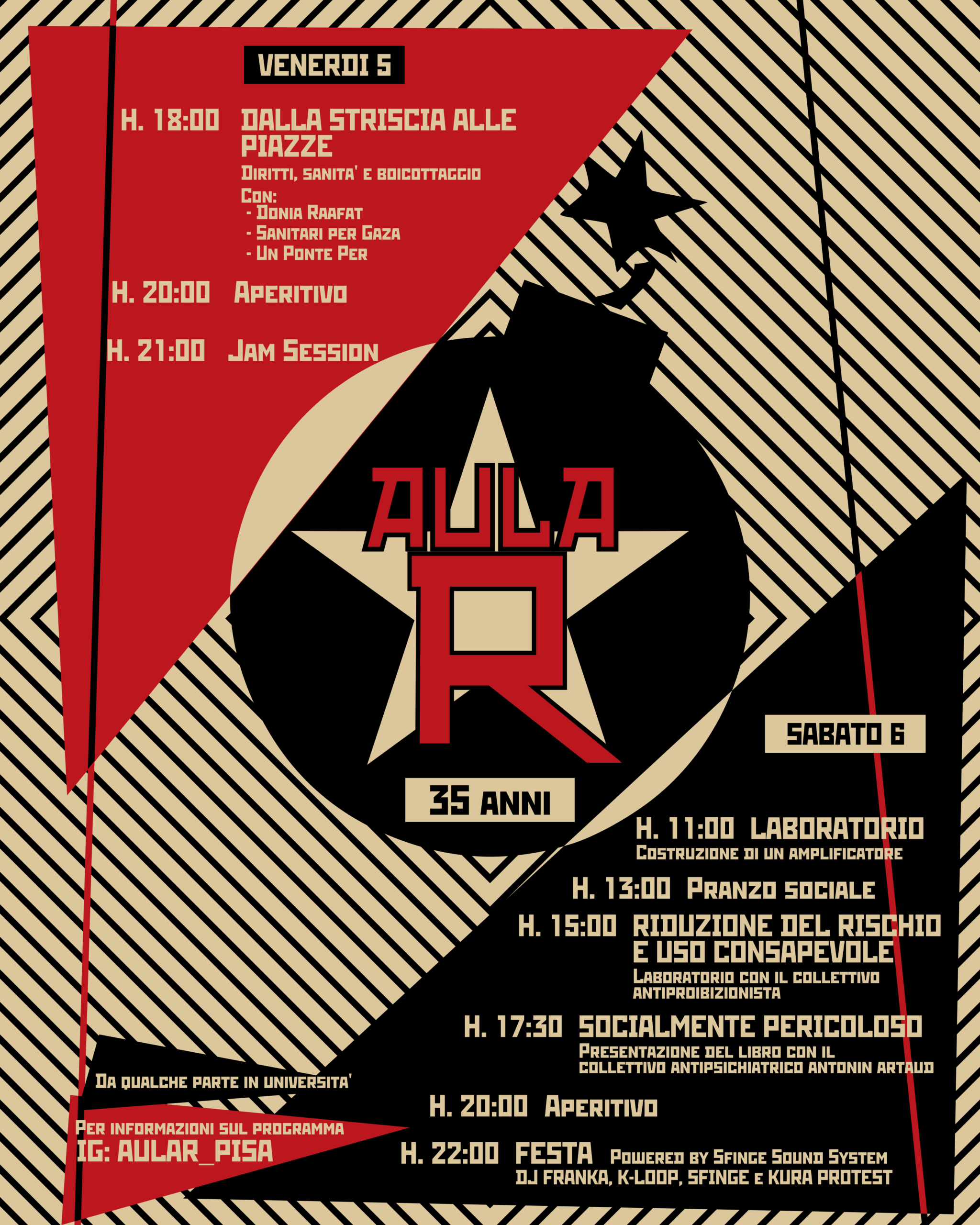 Come attuale assemblea dell’Aula R vogliamo condividere questi 35 anni di militanza insieme alle persone che hanno attraversato questo spazio e a chiunque vorrà passare da qui, ri-partendo dai temi che hanno caratterizzato maggiormente l’attività dell’Aula negli ultimi anni.